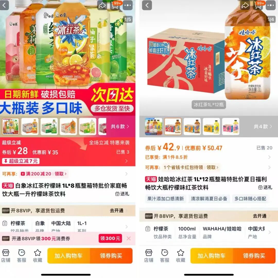 不过,从目前电商平台的售价来看,能把1L装降到3元价格带的,依然是冰红茶品类,比如在某些非官方店铺,白象的1L冰红茶可以买到3.5元/瓶,娃哈哈的1L冰红茶可以低至3.32元/瓶。