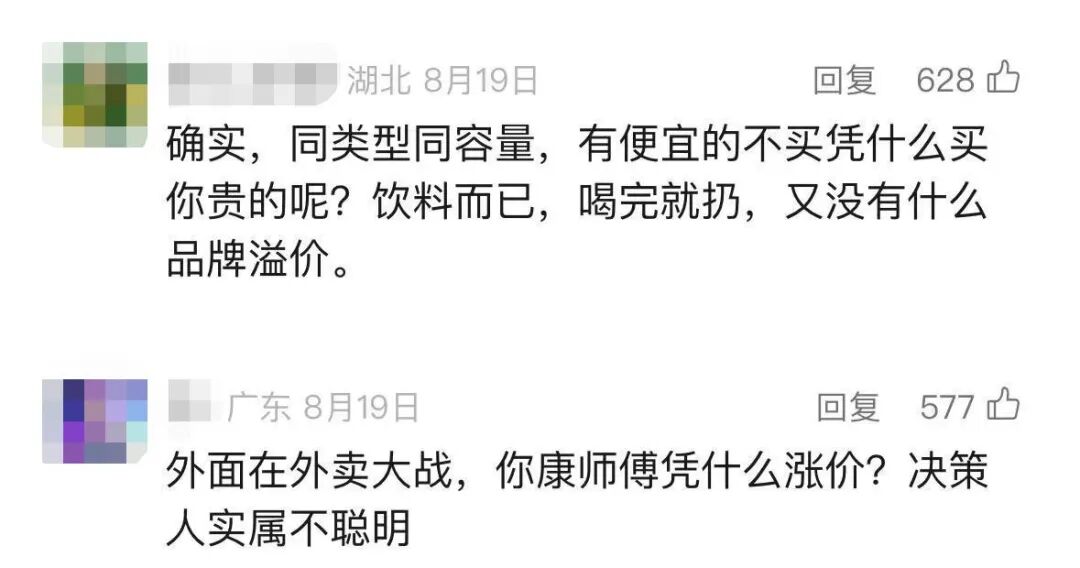 而上周我推送的一篇《巨亏7亿!康师傅被“涨价策略”反噬了》就很能说明这一点。从粉丝留言就能看出,面对康师傅一意孤行的涨价,很多人选择的是转身离开,不带一丝犹豫。