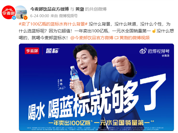 今年6月,今麦郎邀请影帝黄渤拍摄了一支广告片,为旗下的1元蓝标水做宣传。