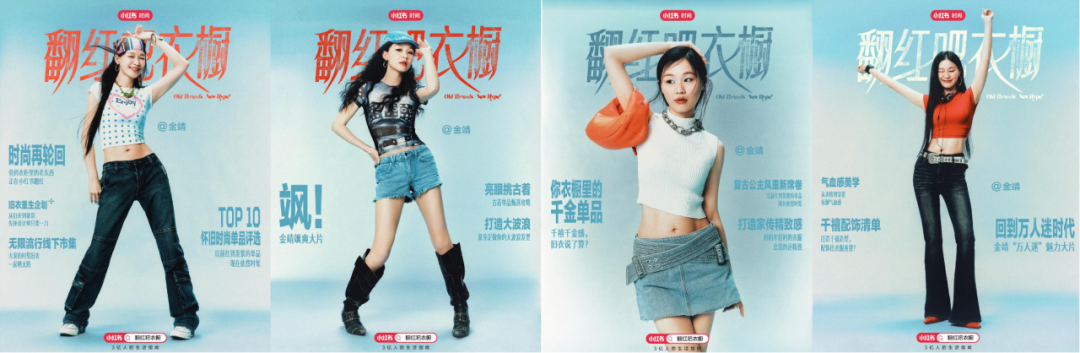在这次活动中,小红书特邀演员金靖担任“千禧时尚引路人”,以一组复古大片重现2000年代经典穿搭。低腰微喇牛仔裤、韩剧千金长靴、尖头鞋、牛仔贝雷帽等标志性单品再次进入大众视野,激发用户对旧衣的改造灵感。