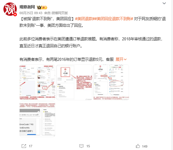 事情的起因是有网友在社交平台爆料,自己在美团购买的团购券过期后,平台显示“退款成功”或“美团审核中”,但退款却迟迟没有到账。