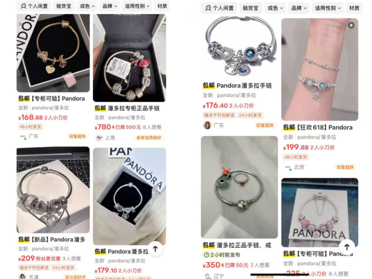 不少消费者吐槽没买多久的首饰已经氧化发黑,花的大价钱还不如买黄金。在闲鱼上,潘多拉首饰的二手价格更是跳水价,原价几千元的手链,只需100多的价格就出手的比比皆是。