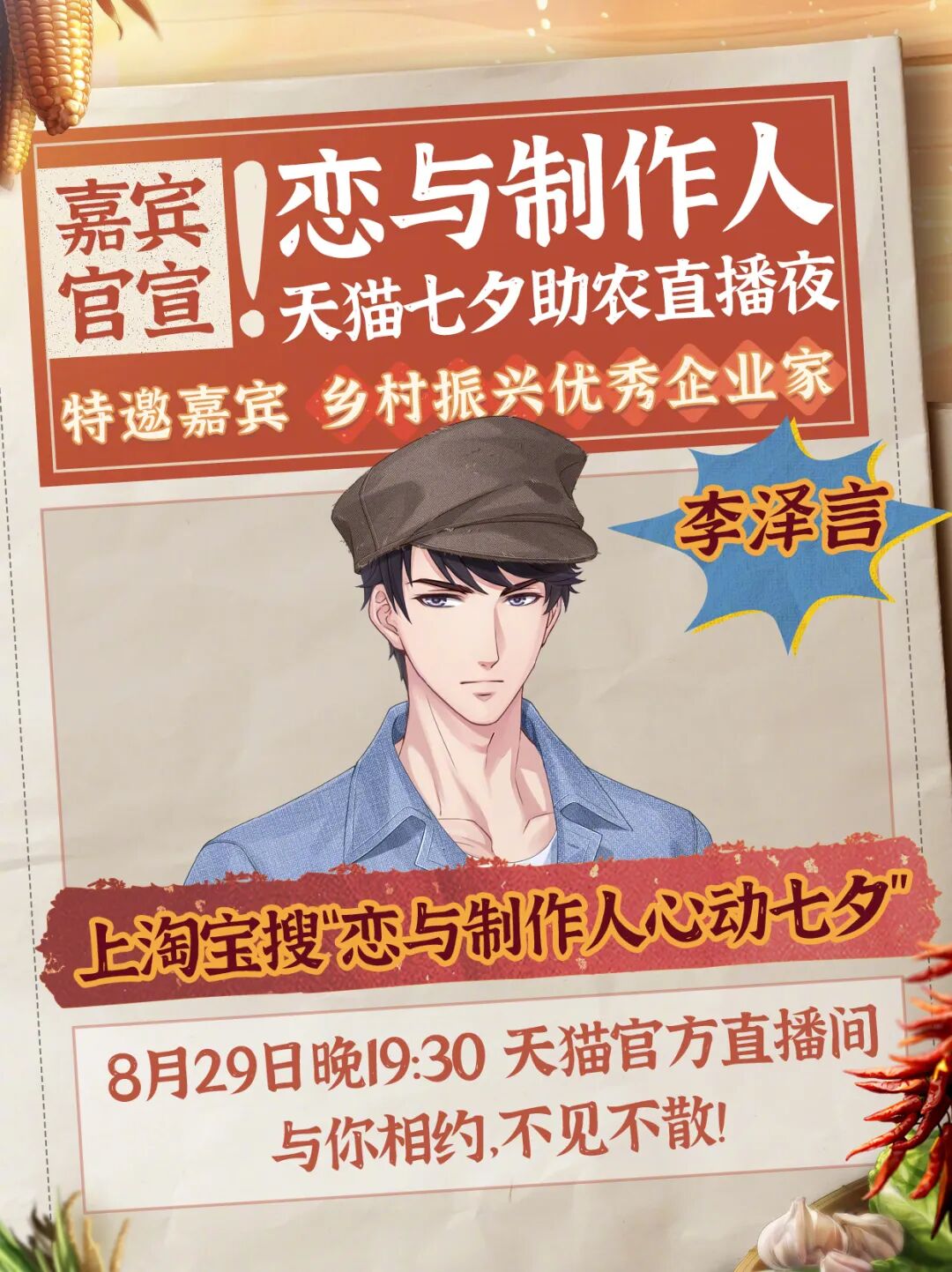 活动期间,天猫与《恋与制作人》围绕 “振兴乡村” 主题,让五位游戏男主化身新手主播,携手天猫 IP 公仔猫天天,亮相天猫官方直播间开启助农直播。