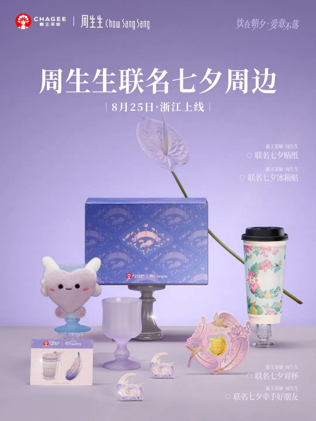 2025 年七夕,茶饮赛道头部品牌霸王茶姬与珠宝领域经典品牌周生生跨界联动,以 “饮在朝夕,爱意不落” 为核心主题,在浙江打造了一场覆盖线上线下的浪漫营销活动。