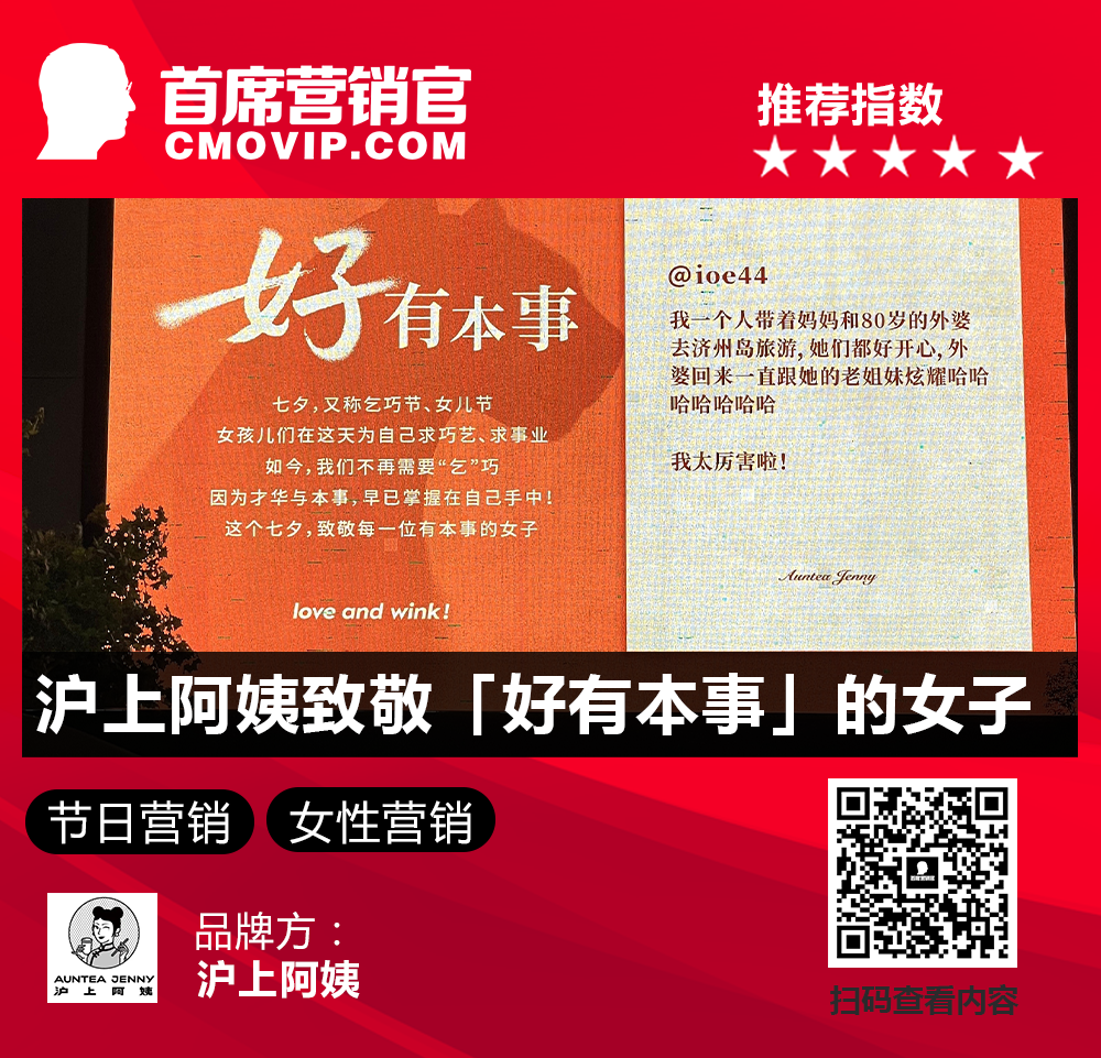 点评:此次七夕营销,沪上阿姨精准洞察了当下女性对于自我价值认同的追求,将品牌理念与女性力量深度融合,也在消费者心中树立了积极向上的品牌形象。
