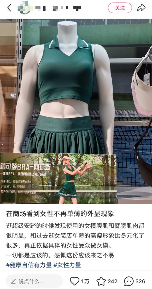最近,一网友发布了一条小红书,引起热议。她发现安踏门店里的女模特能看到明显的腹肌和手臂上的肌肉线条,和过去在女装店里看到又高又瘦的单薄形象完全不一样,打破了人们对“女模特”的固有想象。