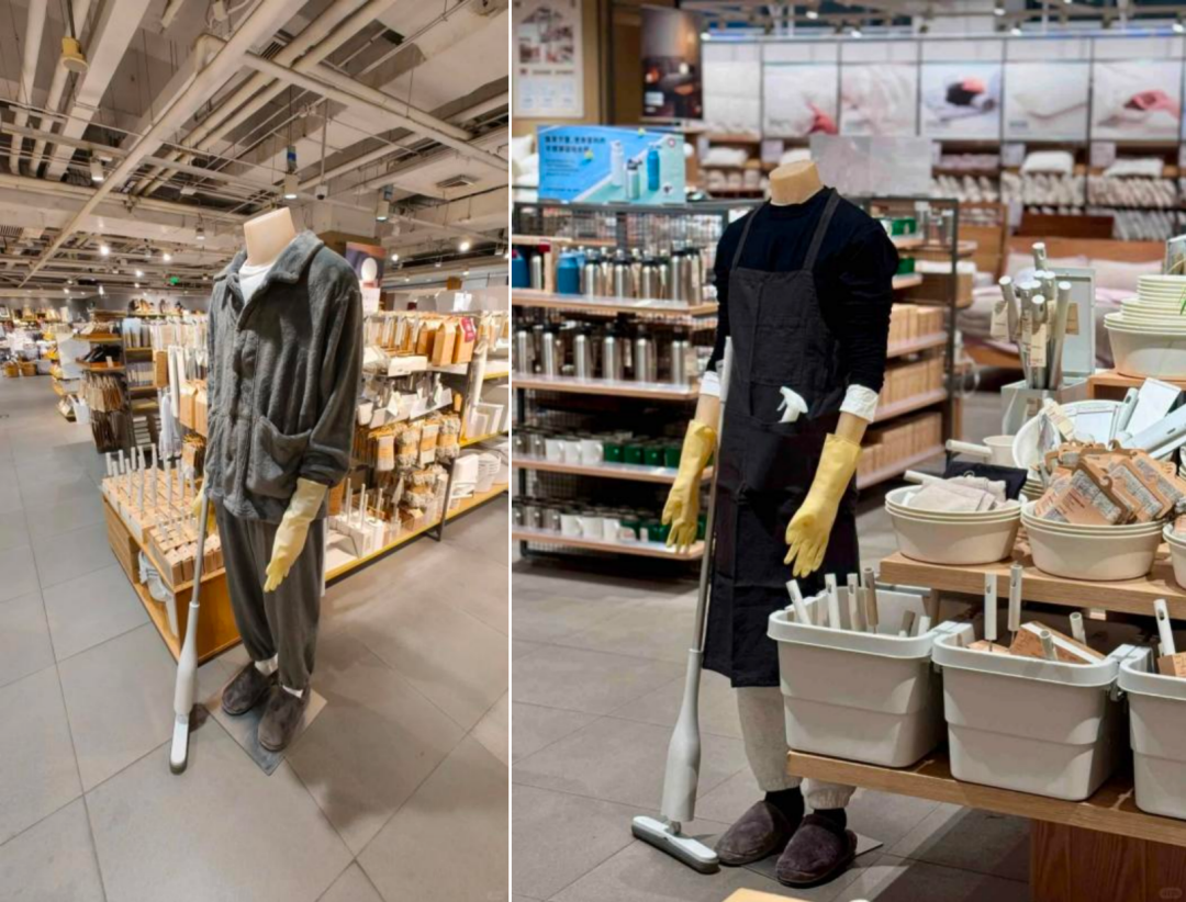 比如无印良品,也是因假人模特出圈被网友点赞。2024年11月,无印良品在门店内设置男模特身着围裙、手持拖把和手套的“暖男套装”造型,通过无声的陈列传递“男性做家务同样有范儿”的信息,打破了“家务是女性专属”的传统观念,引发女性消费者的共鸣,被视为“好男人营销”的典型代表。