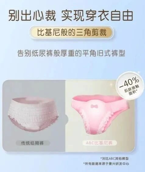 安睡裤作为女性生理期的刚需卫生用品,核心价值从来都是安全防漏、贴身舒适、方便实用,但ABC的“比基尼安睡裤”却打着“别出心裁 实现穿衣自由”的口号,把本应宽松贴合的安睡裤,设计成类似比基尼的低腰窄裆款式,还打出一个“经期性感”的slogan,精准踩中了女性消费者的雷区,引发集体吐槽。