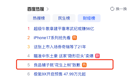 8月29日下午,“良品铺子就‘花生上树’致歉”话题冲上热搜,并在当天15:26时曾一度冲上百度热搜财经榜前几名。