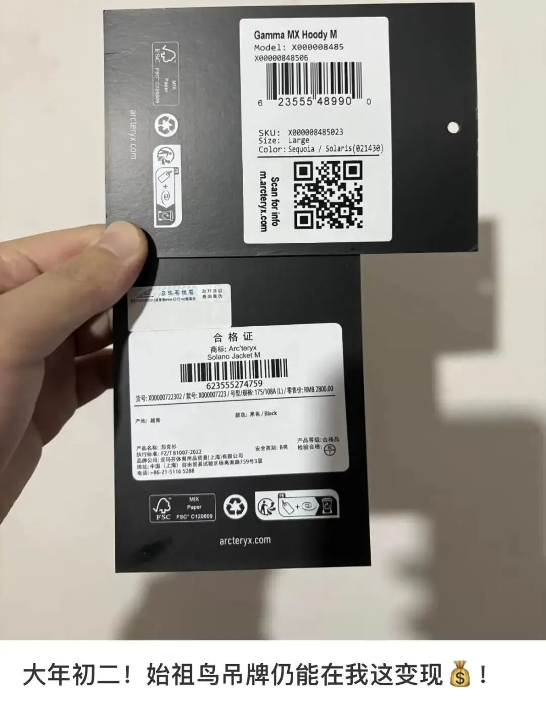 如前段时间,始祖鸟的吊牌在社交媒体上一张最高卖到了200元,就是你买完衣服,把那看起来平平无奇、甚至有点碍事的小纸片摘下来,转手一卖,说不定就能回本一小半。