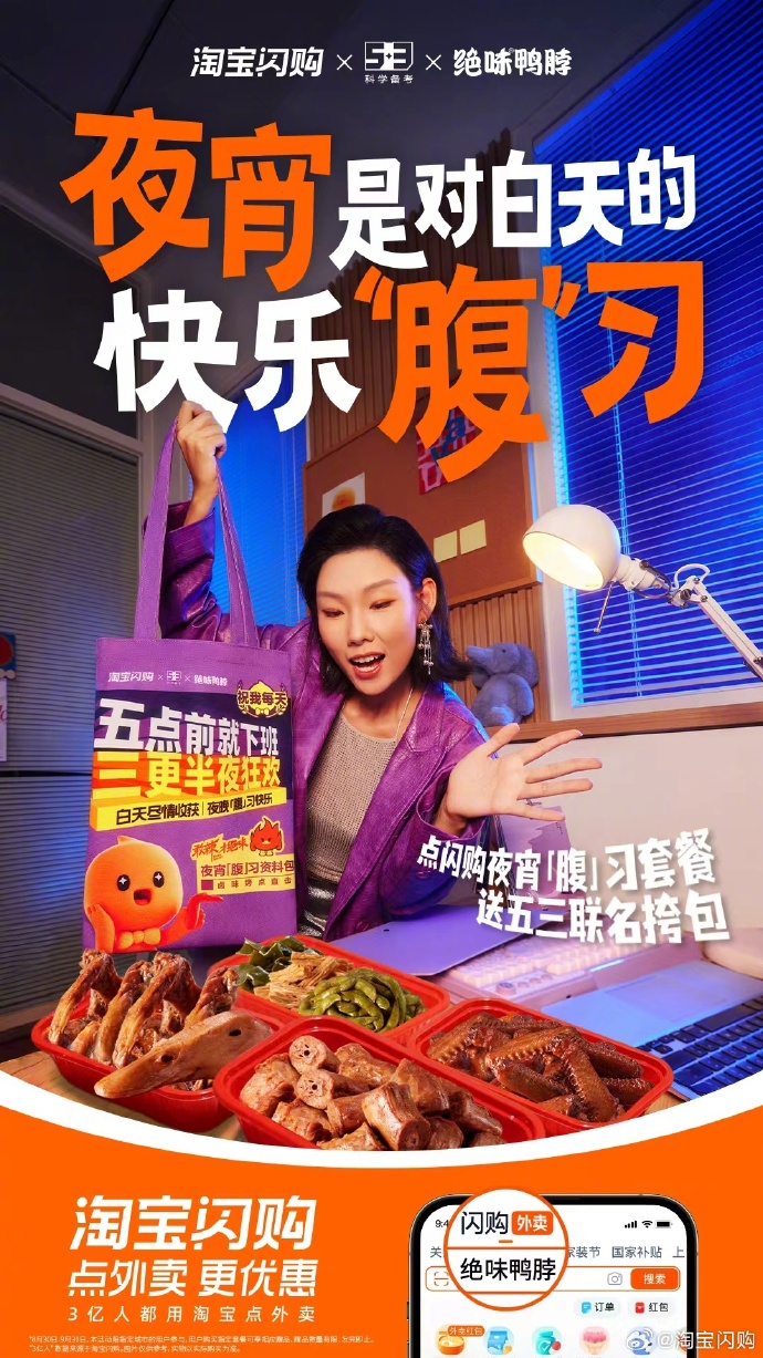 活动核心玩法聚焦「购夜宵送五三联名周边」:用户在淘宝闪购频道下单指定夜宵套餐,即可随机获得限量版「五三腹习包」—— 以《五年高考三年模拟》经典封面为设计灵感,融入烫金书名与学科元素,兼具实用收纳与收藏价值。