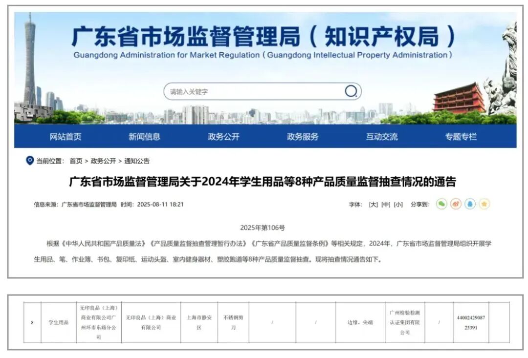 今年8月14日,广东省市场监督管理局发布了关于2024年学生用品等8种产品质量监督抽查情况的通告。其中无印良品(上海)商业有限公司生产的不锈钢剪刀,出现在了不合格产品名单中。