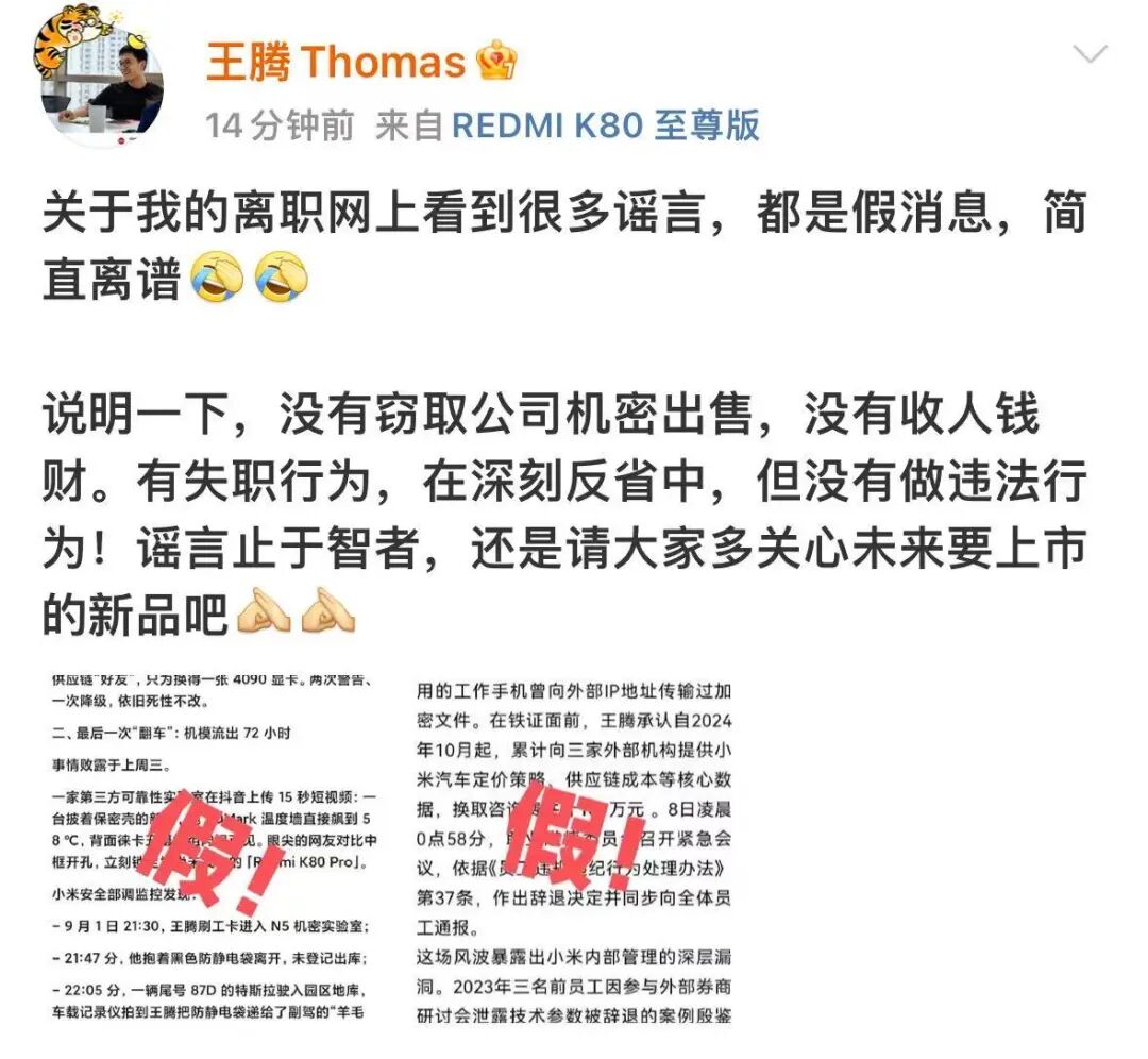 或许是消息越传越不靠谱,王腾不得不在微博进行辟谣,表示没有窃取公司机密出售,没有收人钱财,没有做违法行为,还不忘提醒大家多关心小米未来要上市的新品。