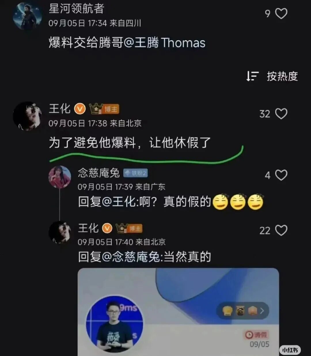 而就在今年9月5日,王化还在回复网友评论时调侃王腾“为了避免他爆料,让他休假了”。