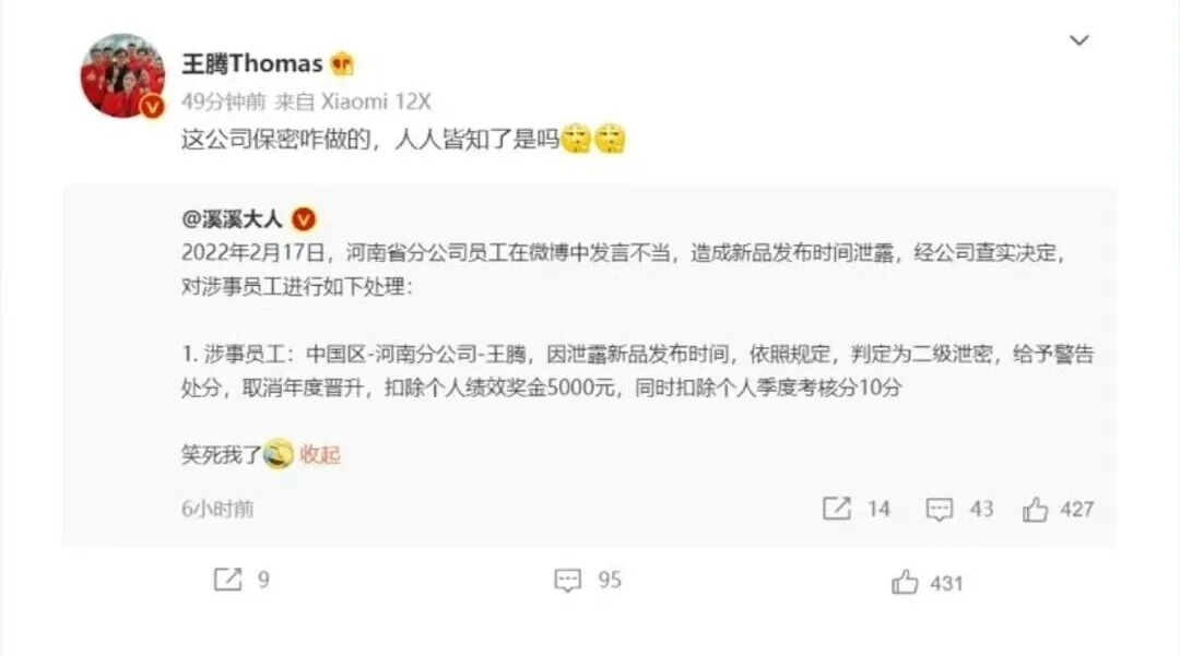 在2022年,因提前泄露Redmi K50标准版发布时间,王腾被判定为“二级泄密”,不仅年度晋升资格被取消,绩效奖金也被扣光。