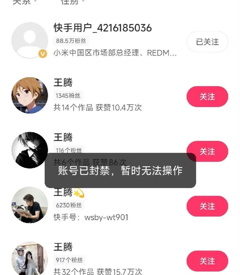 而网友很快发现,王腾微博、抖音等社交媒体账号关于“小米中国区市场部总经理”、“REDMI品牌总经理”等认证已经消失,变成了普通用户,王腾快手账号甚至还被封禁。