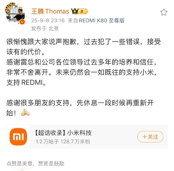 同时,王腾特别感谢了雷军和公司各位领导多年来的培养和信任,称“非常不舍离开。未来仍然会一如既往地支持小米,支持REDMI。”