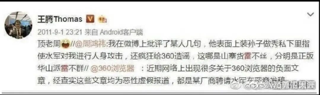 据说在加入小米之前,王腾曾自嘲自己是“米黑”,周鸿祎和雷军在互联网打“口水仗”时,王腾还公开站队过周鸿祎。