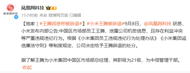 有人称王腾泄密的是新品规划、季度定价策略等信息,这些信息涉及小米2024年下半年重点机型的发布节奏,因而彻底惹怒了雷军;有人猜测“利益冲突”是指王腾亲属控制的公司与小米存在业务往来并从中谋取暴利,触碰了商业道德的红线,让小米对他痛下杀手。