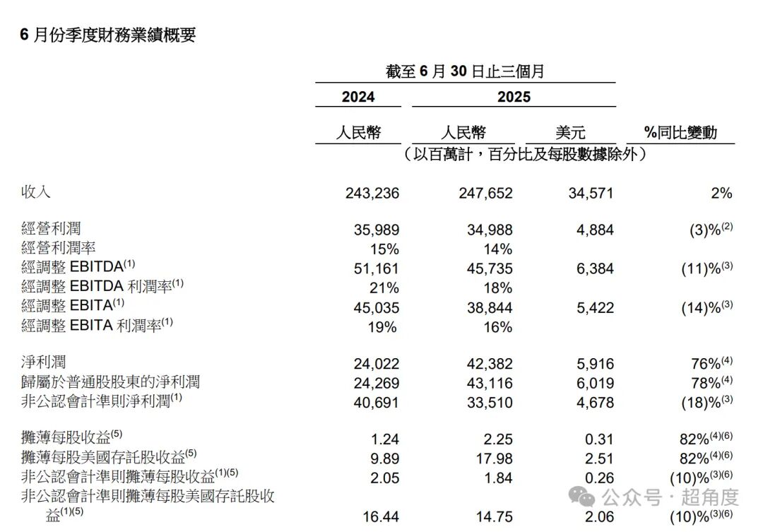 最后来看阿里,其虽未全面参战,但也难以独善其身。在今年二季度,阿里营收2476.52亿元,同比微增2%,净利润同比增长76%。不过若是剔除股权投资等因素,在更反映主营业务经营情况的非公认会计准则下,其净利润为335亿元,同比下降18%。