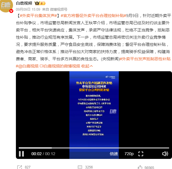 眼看着外卖大战平等暴击了每一方参与者,9月9日,市场监管总局召开例行发布会,称市场监管总局已经及时约谈主要外卖平台,相关平台快速响应,集体发声,承诺严守法律法规,杜绝不正当竞争,抵制恶性补贴,推动行业规范有序发展。