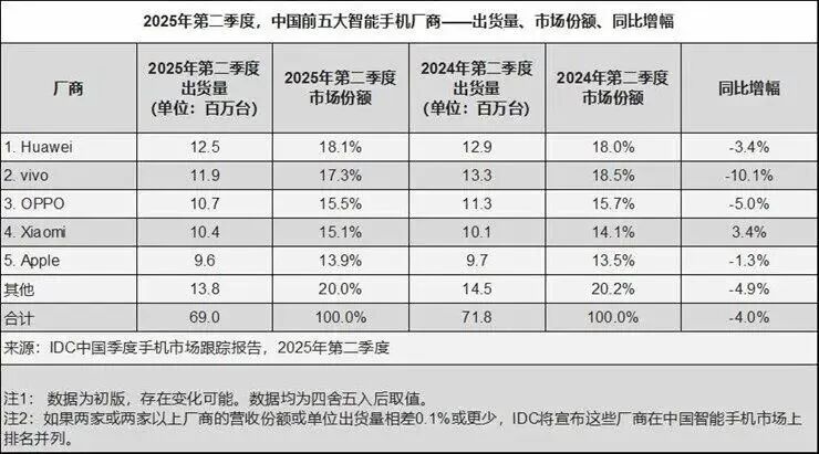 ●图注:二季度苹果出货量同比下降1.3%,市占率排名第五