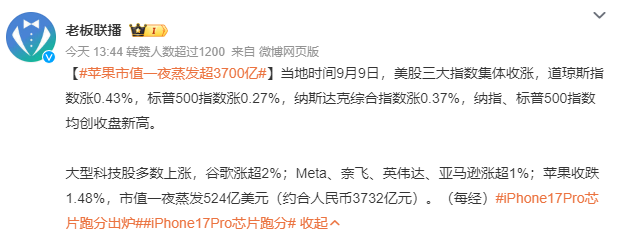 苹果发布会当天的美股一片向好,道琼斯指数涨0.43%,标普500涨0.27%,纳斯达克综合指数涨0.37%,后两者均创收盘新高。