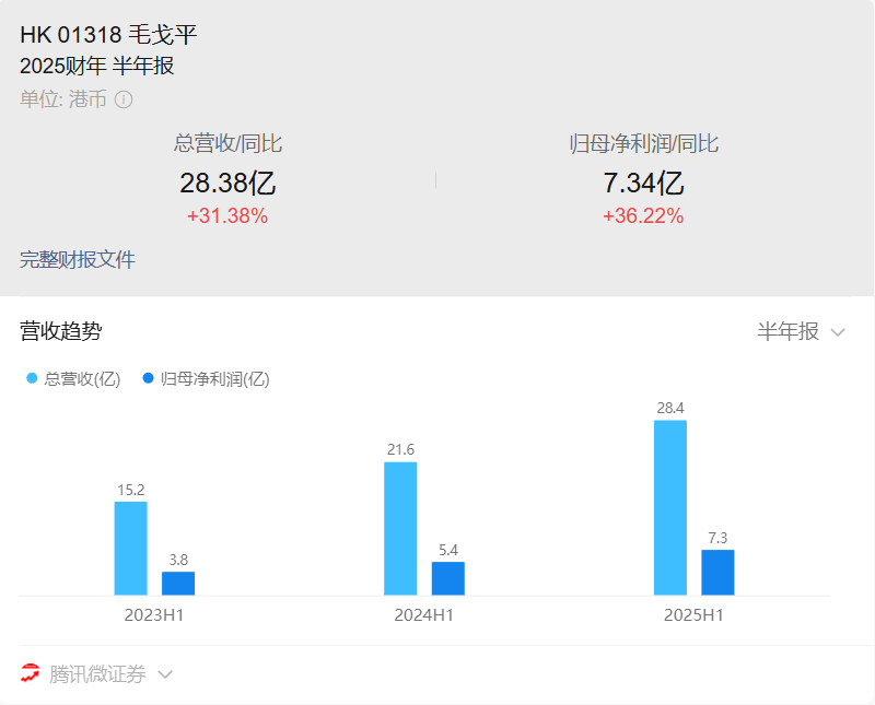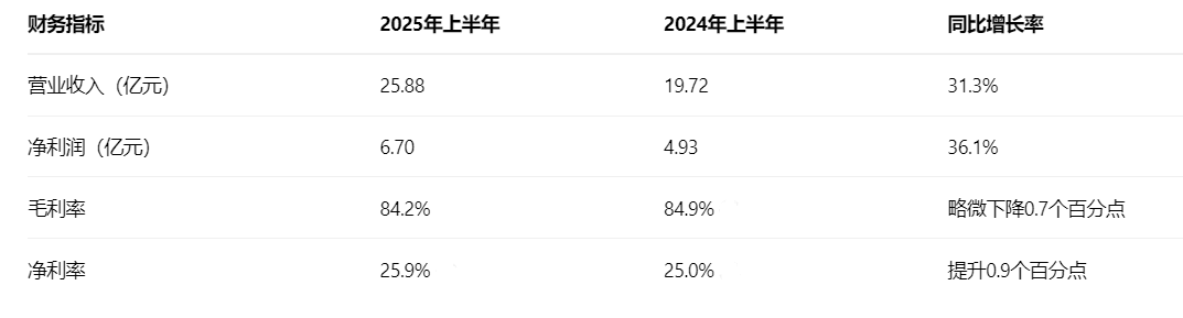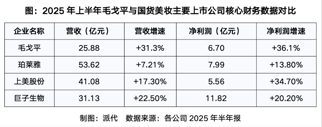 在这一浪潮中,毛戈平抓住了红利。2025上半年,其营收为28.38亿元,同比增长31.38%;净利润为7.34亿元,同比增长36.22%。
