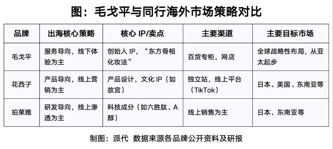 不过,派代研究发现,花西子是通过产品设计、文化IP联名和线上社交媒体营销(如TikTok)迅速在海外市场建立认知度。而毛戈平与近年来以“产品即IP”的轻资产模式出海的新锐品牌(如花西子)相比,毛戈平的模式更为复杂和重资产。
