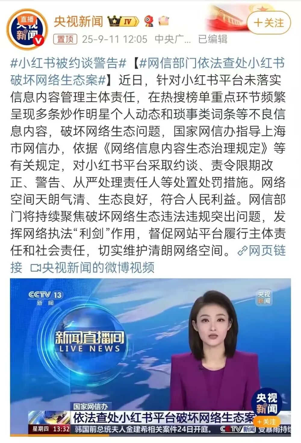 9月11日,国家网信办指导上海市网信办,对小红书采取约谈、责令限期改正、警告、从严处理责任人等处置处罚措施。
