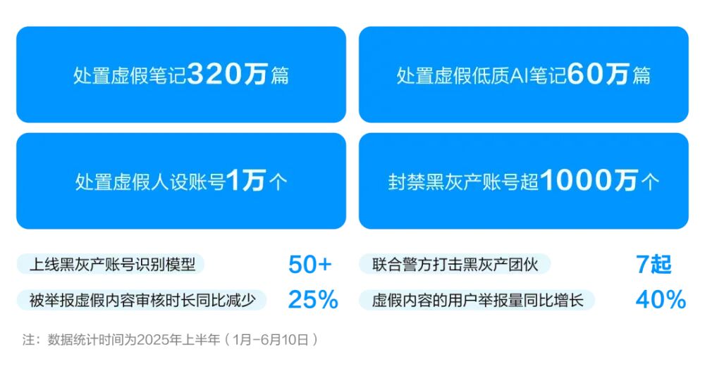光2025年上半年,它就处置了,320万篇虚假笔记,1万个虚假人设账号,60万篇低质AI笔记,1000万个黑灰产账号