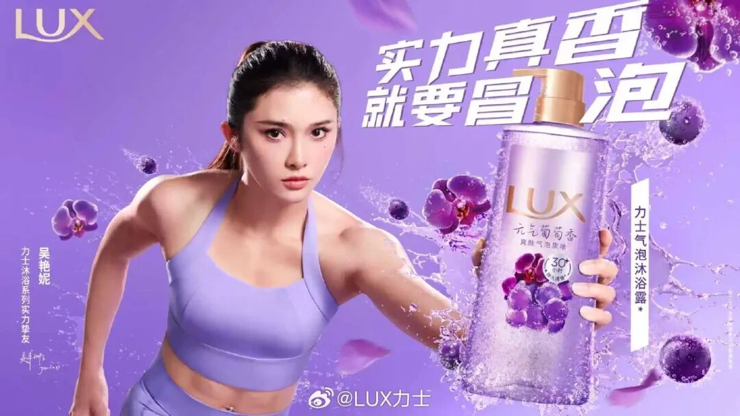 另一方面,该文案也巧妙地将力士气泡沐浴露使用时会产生丰富泡沫的产品特点融入其中,让人在看到广告的瞬间,就能将吴艳妮的实力与沐浴露的优质体验紧密联系起来,产品、文案与代言人之间的适配度堪称完美。