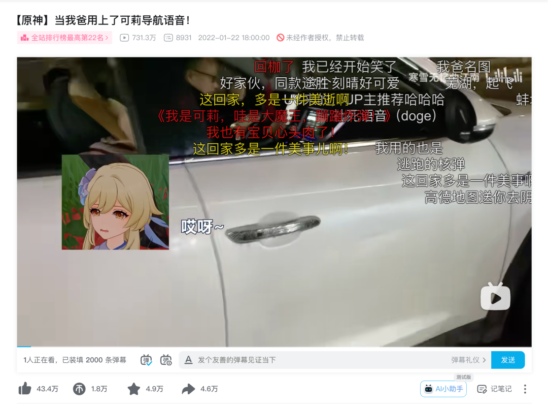 有网友将家里的导航语音更换成“可莉”语音包,随后一条标题为“当我爸用上了可莉导航语音”的视频在B站全站排行榜最高第22名,截至目前播放量已超730万。而在小米应用商店的高德地图评论区里,一条“就凭可莉给你五星”的热门评价也收获2000多个点赞。