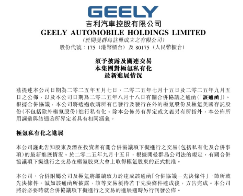9月15日,吉利汽车(0175.HK)发布公告称,有关合并协议项下拟进行的交易(包括私有化及合并事项)在极氪股东大会上取得正式批准。此前,吉利汽车行政总裁、CEO桂生悦表示,吉利和极氪的“大合并”交割工作有望在今年年底前完成。