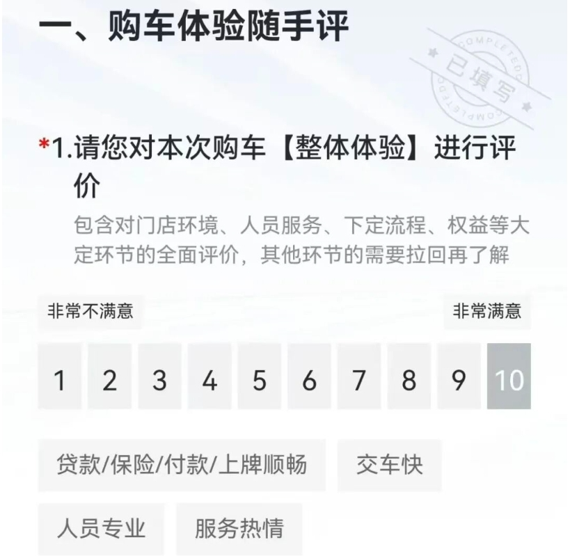 极氪已经有这个意识了,尤其在林杰接手极氪销售后,极氪的服务体系确实有所改变。有媒体报道,极氪已经提升了客户打分的标准;此前极氪没有硬性要求,现在只要对客户做完服务,无论是订车还是试驾,都要让客户打一个10分的好评,还要拍照发到工作群里,证明真实性,店长再统计上报。而且即使有的用户是愿意根据自己的体验和判断打一个8分或9分的,但现在这是不被允许的,必须是10分。