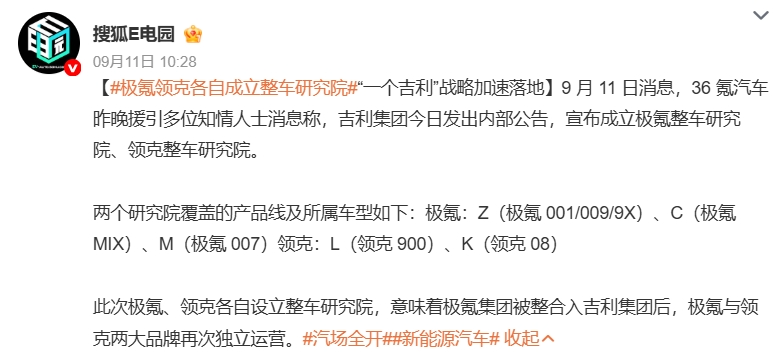 此次极氪、领克各自设立整车研究院,意味着极氪集团被整合入吉利集团后,极氪与领克两大品牌再次独立运营。