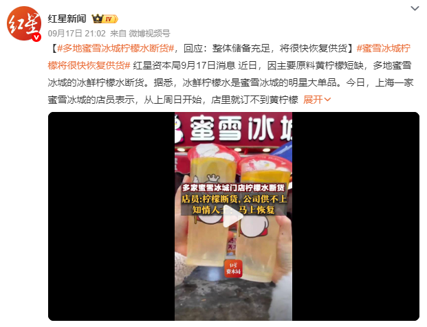 蜜雪冰城方面对断货的回应是,近日一批进口柠檬受天气影响延期到港,同时川渝柠檬已经进入采摘期,因需储存一段时间优化口感,导致了部分区域出现供应紧张的情况。