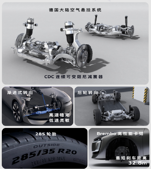 底盘部分,除了首次在电动车上搭载了奥迪引以为傲的quattro四驱系统,还配备了CDC连续可变阻尼减震、自适应空气悬架、Brembo四活塞卡钳以及后轮转向,制动距离仅32.8米,刷新同级纪录。