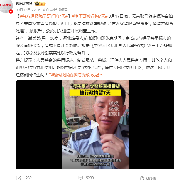 近日,我局接群众举报称:“有人穿警服直播带货,请警方调查处理”。接报后,公安机关迅速开展调查工作。