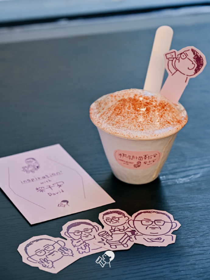 最让人眼前一亮的是喜茶这次的包装设计。他们把黎子安最具标识性的形象——推小推车、三指比耶、抱猫咪,还有那个经典的出神状态,统统用童趣稚拙的笔触画了出来。简洁线条勾勒,神韵十足,童趣风格与美食严肃性形成反差萌。从杯贴到插卡,每个细节都有黎大厨的影子,让"松弛感"变成了可触摸的设计元素。