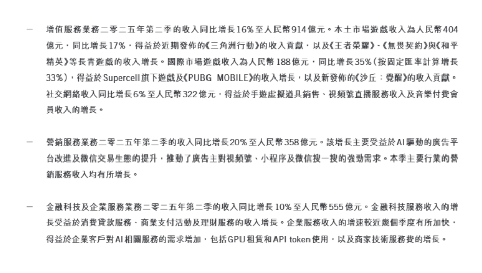 今年二季度,腾讯云所在的“金融科技及企业服务”业务实现营收555亿元,同比增长10%,增速回归到两位数;主要受益于“企业客户对AI相关服务的需求增加,包括 GPU 租赁和 API token 使用,以及商家技术服务费的增长。”