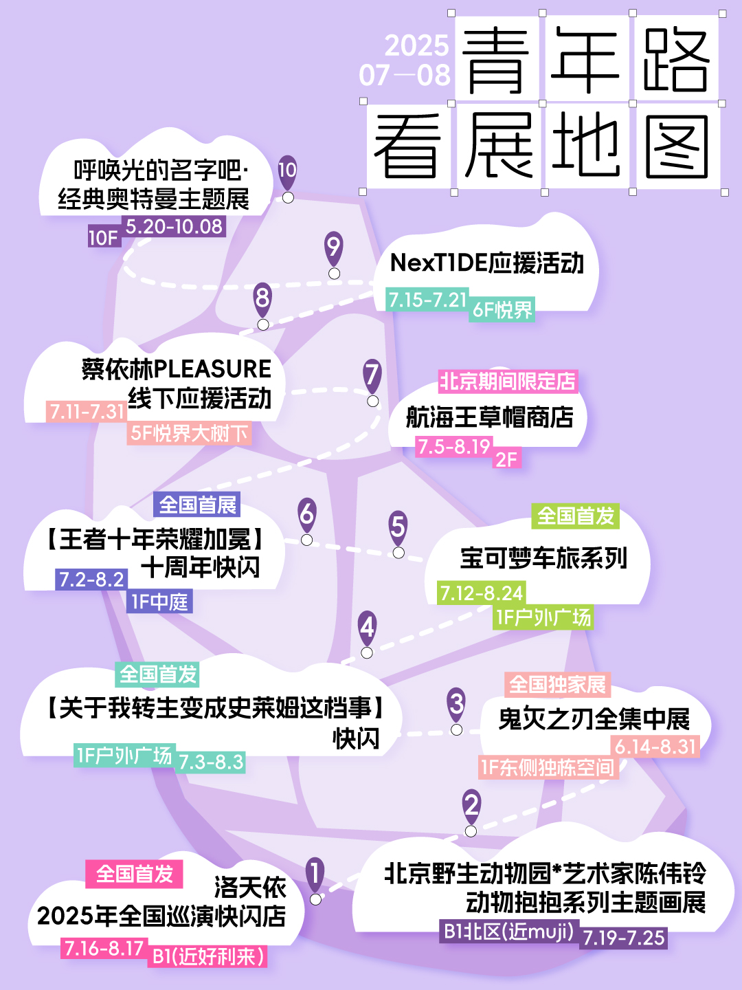 以北京朝阳大悦城为例,以高流量、稀缺性IP首发为特色,每年策划近200场文化体验活动。光是今年7-8月,这里就密集落地宝可梦车旅系列、鬼灭之刃全集中展、王者荣耀十周年加冕快闪、洛天依2025全国巡演快闪店等全国首发首展。