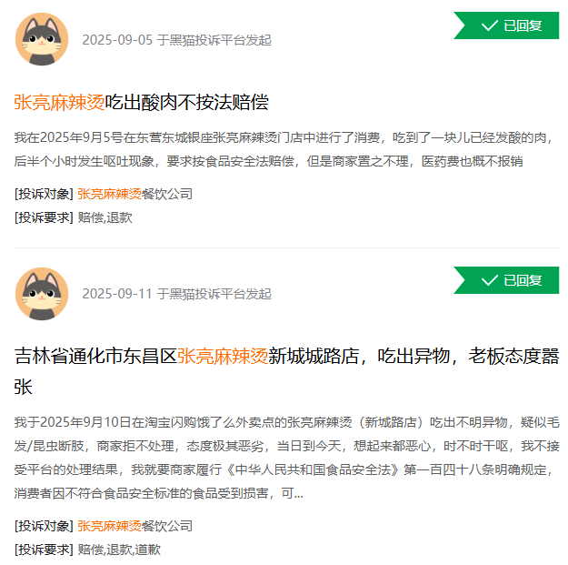 更早之前或在这之后,和张亮麻辣烫食品安全相关的问题时有发生。截止到目前,黑猫投诉平台上有关张亮麻辣烫的投诉量接近2000条,大多数集中在食物变质、有异物等问题。