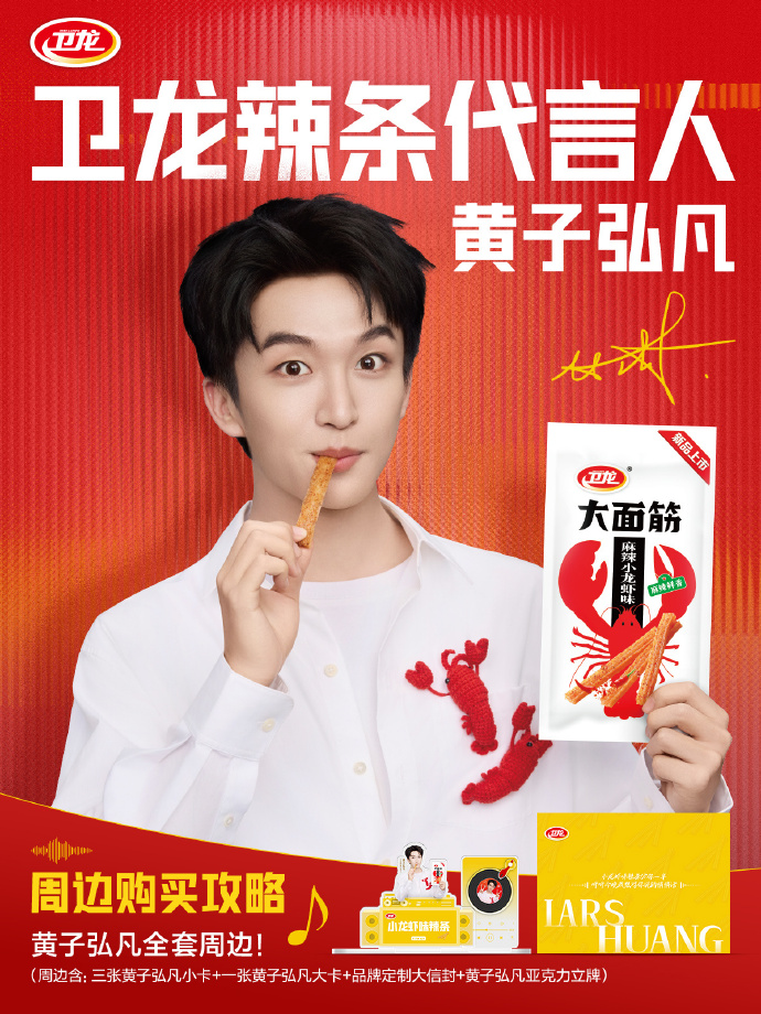 卫龙正式宣布青年歌手黄子弘凡成为其辣条系列产品代言人,同步上新麻辣小龙虾味辣条。