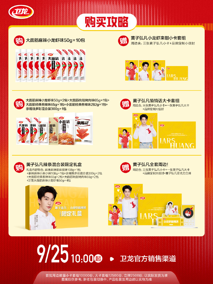 这次的新品麻辣小龙虾味辣条,融合了经典辣感与海鲜风味,以 Q 弹嚼劲与层次丰富的味觉体验。除此之外,还有黄子弘凡全套周边同步上线。包括三张黄子弘凡小卡,一张黄子弘凡大卡,以及品牌定制大信封、黄子弘凡亚克力立牌等。