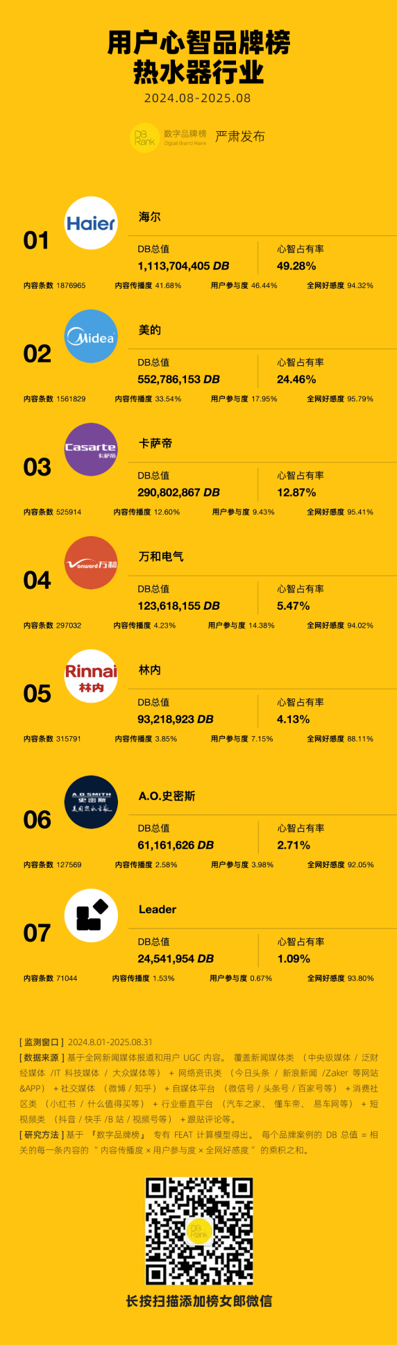 一切创新都是为了更具温度的美好生活,用户的选择是对这份付出最好的反馈。『数字品牌榜』以2024年8月1日-2025年8月31日为时间窗口,推出“用户心智品牌榜-热水器行业”榜单,海尔热水器以1,113,704,405 DB的数字品牌价值、49.28%的行业用户心智占有率位列榜首。