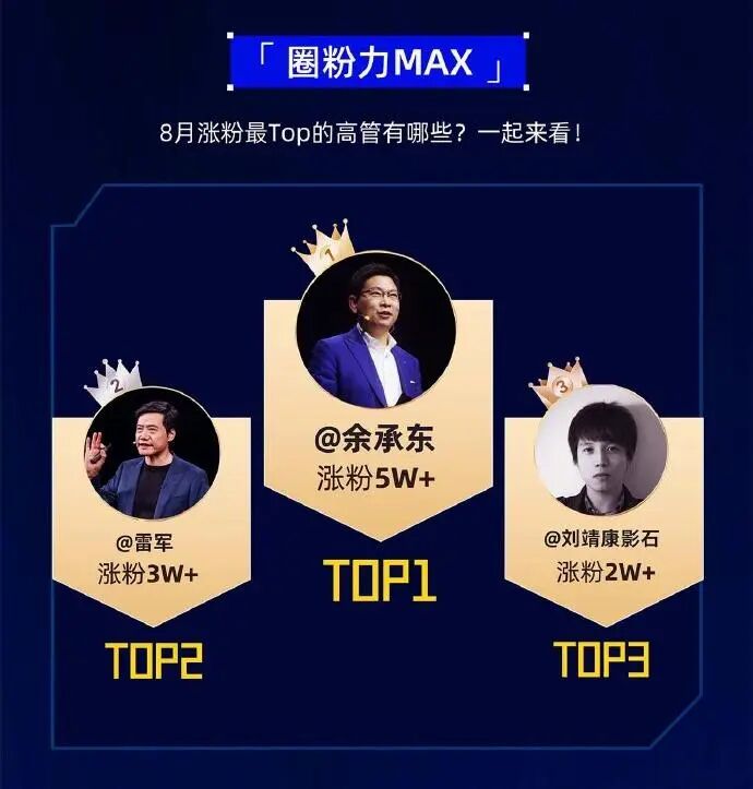 再看看华为常务董事、终端BG董事长余承东,微博粉丝量858万、抖音粉丝量1633万,在社交平台圈粉无数。仅微博平台,8月就涨粉5W+,在消费电子行业中成为涨粉最多的高管。
