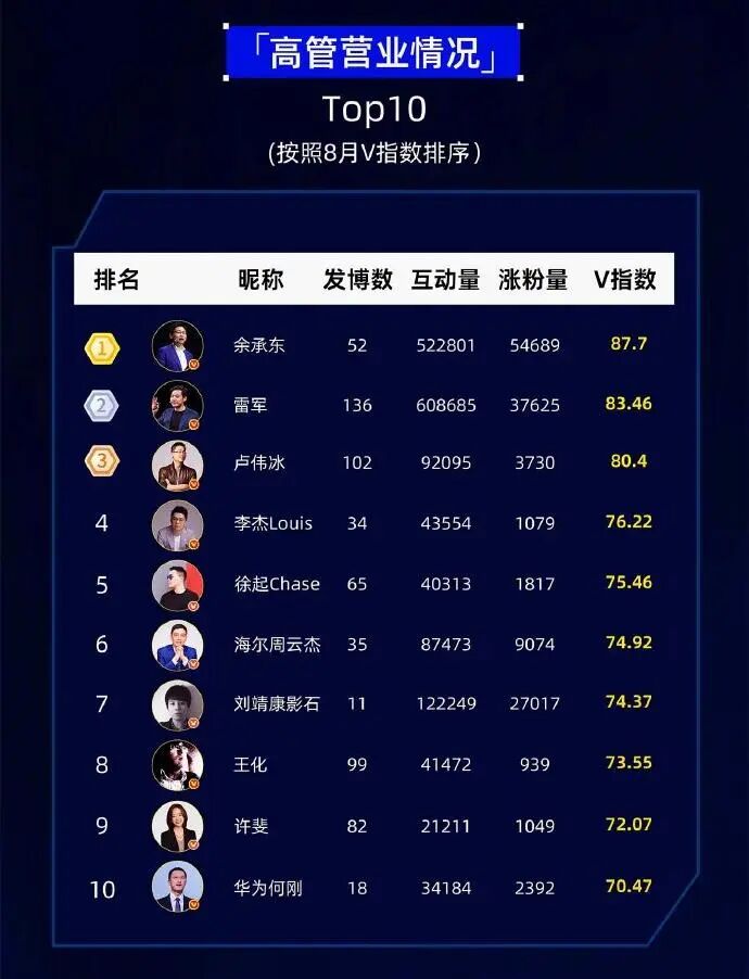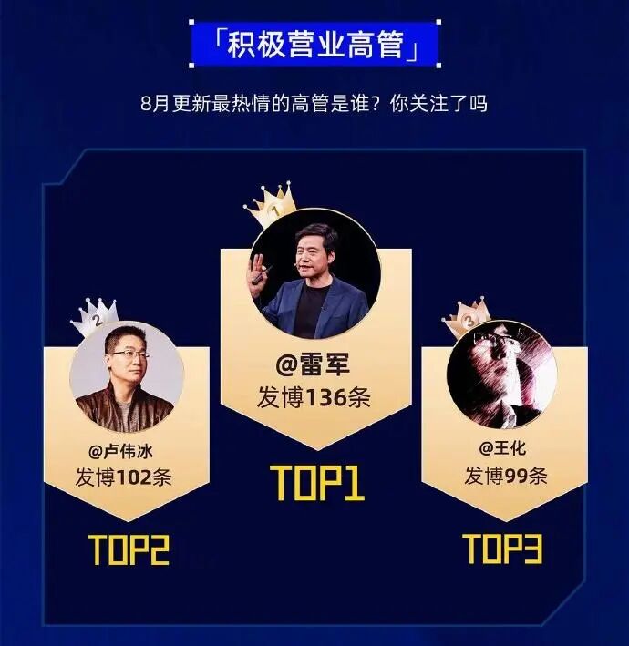 不止雷军,小米集团合伙人、总裁卢伟冰,公关部总经理王化,CMO许斐都在微博积极营业,并入选微博8月消费电子行业高管月报高管营业情况TOP10,分别位居第三、第八、第九名。