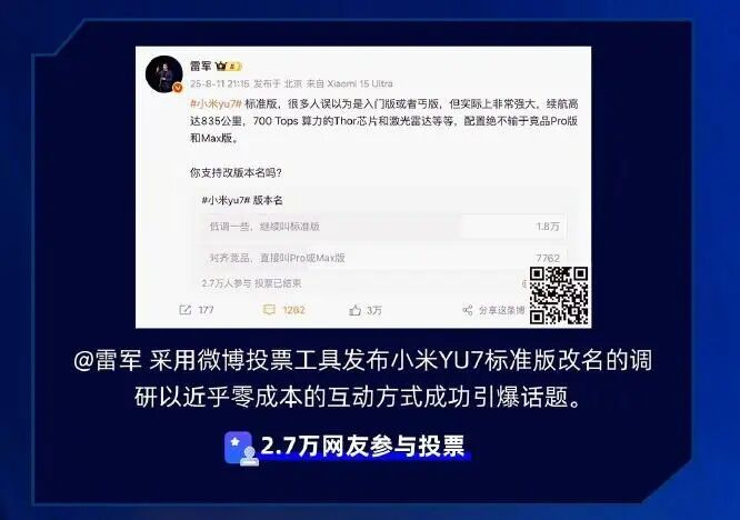亲自下场运营社交媒体还为高管提供了一个绕过中间环节、直接获取公众真实反馈的宝贵窗口,对于产品迭代、战略决策具有不可替代的价值。前段时间,雷军采用微博投票工具发布小米YU7标准版改名的调研,有2.7万网友参与投票,既收获了公众意见,又以近乎零成本的互动方式成功引爆话题。