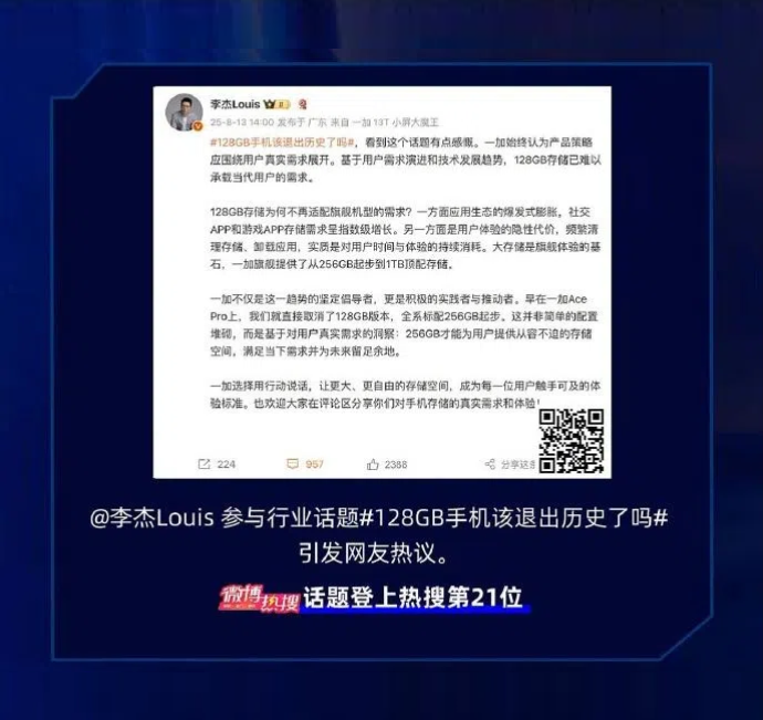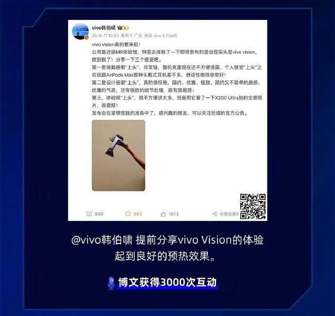 再者,微博具有独一无二的热点话题引爆能力,无论是正面话题还是负面话题,当品牌事件成为公共事件时,微博肯定是第一舆论场。品牌高管在微博的发声,不仅能第一时间应对舆情,也更容易实现破圈,在营销中打造出爆款。8月,一加中国区总裁李杰参与行业话题#128GB手机该退出历史了吗#的讨论,引发行业热议,助力话题登上热搜的同时,也极大加深了一加手机在网友心中的占位;同样,vivo产品经理韩伯啸,也提前在微博分享公司新产品vivo Vision的体验心得,获得了大量互动,为新品带来了非常不错的预热效果。